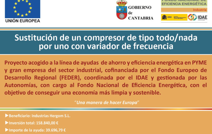 Industrias Hergóm ha obtenido una subvención dentro del PROGRAMA DE AYUDAS PARA ACTUACIONES EN EFICIENCIA ENERGÉTICA EN PYME Y GRAN EMPRESA EN EL SECTOR INDUSTRIAL DE CANTABRIA enmarcado en el Programa Operativo de Desarrollo Sostenible 2014-2020. Los objetivos están enfocados a la Economía baja en carbono y Fomento de la eficiencia energética mediante la mejora de la tecnología en equipos y procesos industriales. Se trata de promover la sustitución de equipos e instalaciones así como sistemas auxiliares consumidores de energía por otros que utilicen tecnologías de alta eficiencia energética o la mejor tecnología disponible con objeto de reducir el consumo de energía final y las emisiones de CO2. La inversión consistió en la sustitución de un compresor modelo INGERSOLL-RAND M132 (132kW), de tipo todo/nada, por otro compresor más eficiente con variador de frecuencia, modelo INGERSOLL-RAND R132ne, lo que ha supuesto una reducción en el consumo eléctrico de 0,028Ktep/año y una reducción anual estimada de gases de efecto invernadero (GEI) de 172,01 TeqCO2/año