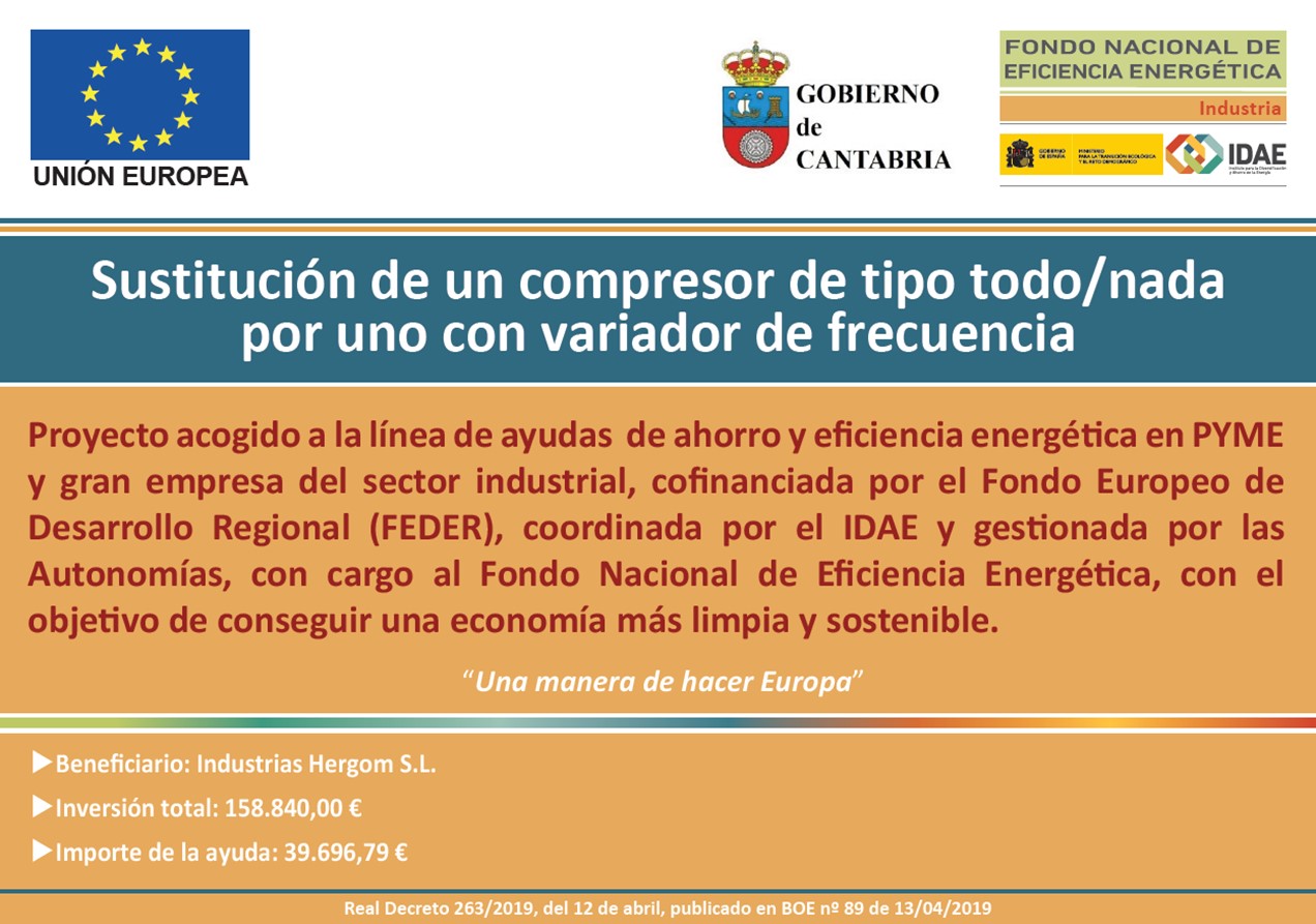 Industrias Hergóm ha obtenido una subvención dentro del PROGRAMA DE AYUDAS PARA ACTUACIONES EN EFICIENCIA ENERGÉTICA EN PYME Y GRAN EMPRESA EN EL SECTOR INDUSTRIAL DE CANTABRIA enmarcado en el Programa Operativo de Desarrollo Sostenible 2014-2020. Los objetivos están enfocados a la Economía baja en carbono y Fomento de la eficiencia energética mediante la mejora de la tecnología en equipos y procesos industriales. Se trata de promover la sustitución de equipos e instalaciones así como sistemas auxiliares consumidores de energía por otros que utilicen tecnologías de alta eficiencia energética o la mejor tecnología disponible con objeto de reducir el consumo de energía final y las emisiones de CO2. La inversión consistió en la sustitución de un compresor modelo INGERSOLL-RAND M132 (132kW), de tipo todo/nada, por otro compresor más eficiente con variador de frecuencia, modelo INGERSOLL-RAND R132ne, lo que ha supuesto una reducción en el consumo eléctrico de 0,028Ktep/año y una reducción anual estimada de gases de efecto invernadero (GEI) de 172,01 TeqCO2/año