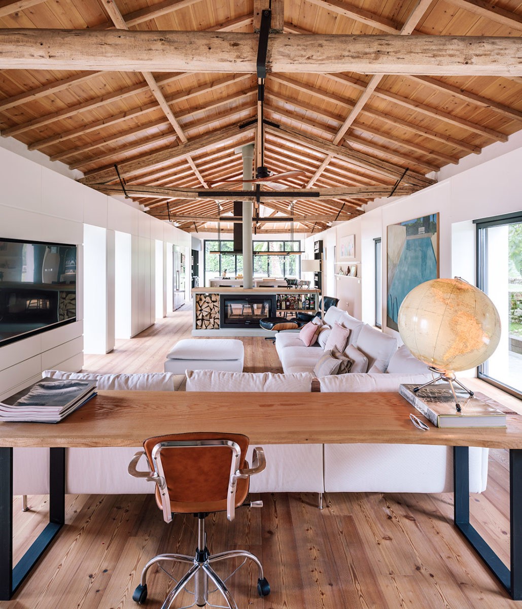 El establo se divide en tres zonas diferenciadas: un gran espacio abierto continuo ordenado mediante piezas exentas que alberga salón-comedor-cocina. Es el corazón de la vivienda. La cubierta de madera está construida de forma tradicional y la chimenea con cristal por ambos laterales de Hergóm, que está ubicada en el medio de la estancia, funciona como separador de espacios.
