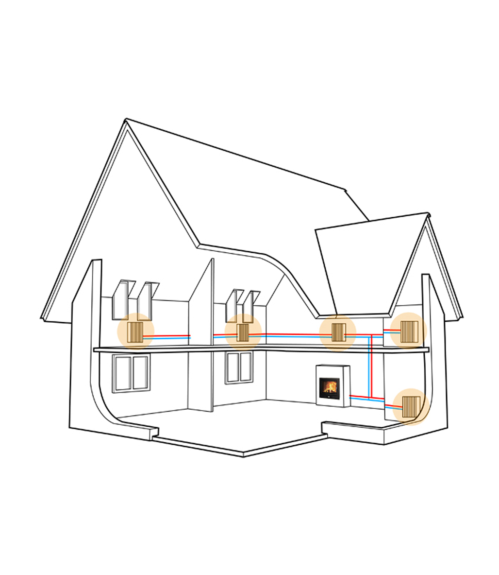 The H-02/22 fireplace heater is prepared for connection to the radiator network to function as central heating, sending hot water to the radiator network of the house. It can be used as the sole heating source or in combination with a traditional boiler.