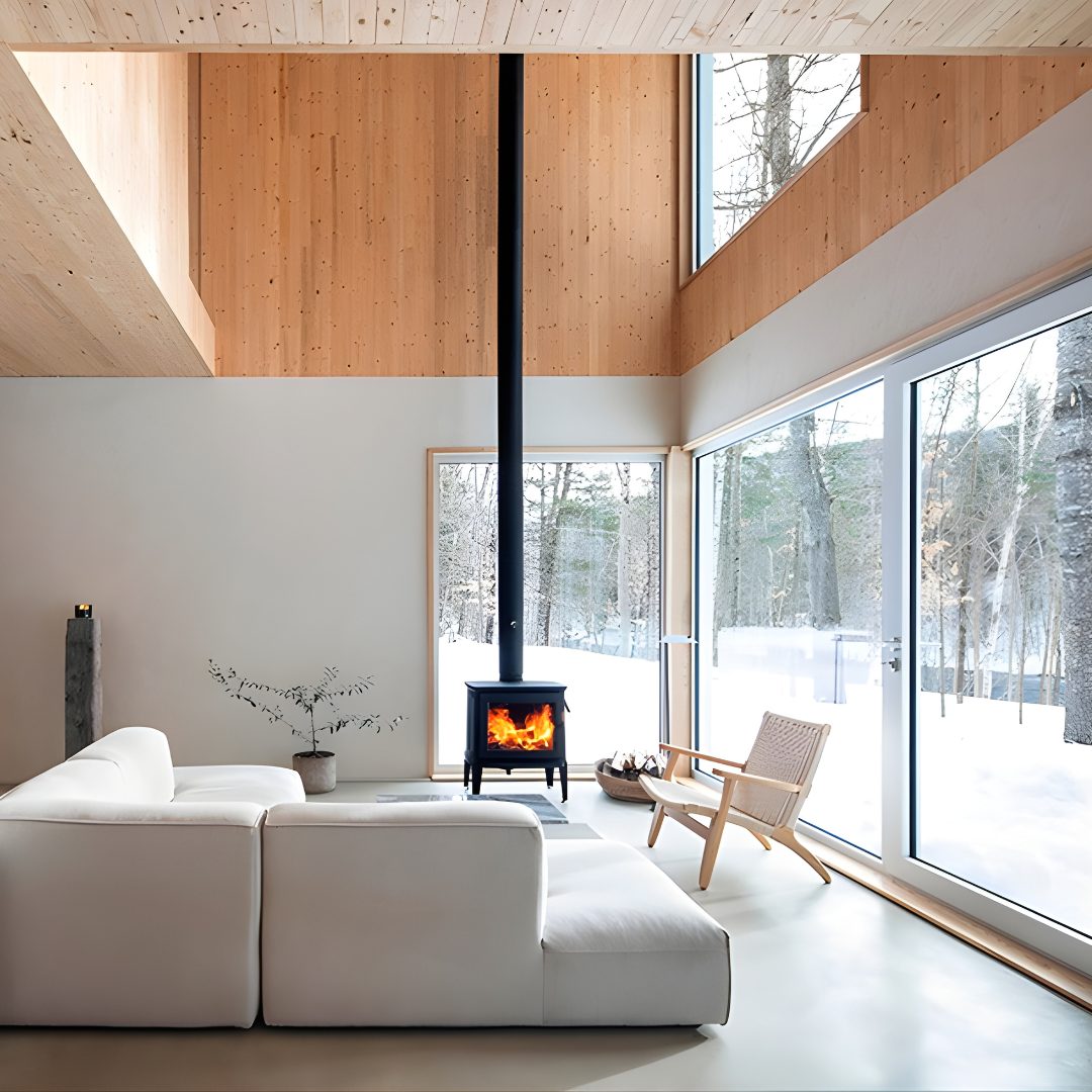 Es en el interior de este espacio minimalista donde la Estufa E-30 de Hergóm cobra protagonismo. Fabricada completamente en hierro fundido de alta calidad, la E-30 no solo proporciona una fuente de calor eficiente y uniforme, sino que su diseño atemporal inyecta la calidez y la tradición del fuego de leña en un entorno moderno y austero.