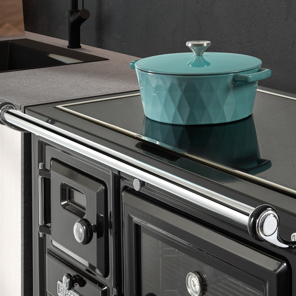 Fabricada en hierro fundido con acabado en esmalte de alta calidad, gran resistencia y una transferencia óptima de calor, la familia de cocinas Saja cuenta con 3 superficies de cocinado: una encimera elevable de cristal vitrocerámico, otra segunda en hierro pulido esmaltado y horno en acero inoxidable.
